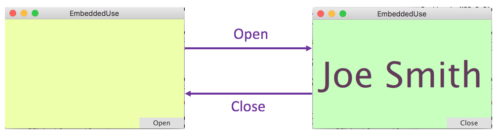 After startup, the application shows the yellowish screen on the left side. When users press the Open button, the onClicked handler of the Button in main.qml dynamically creates a CustomerInfo item and initialises the property customer of this item with the value returned by the function g_customerMgr.randomCustomer(). When users press the Close button in the screen on the right, the onClicked handler destroys the CustomerInfo item again. The QML code of the handler looks as follows.