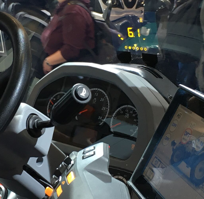 I found a single machine on all of Agritechnica with a head-up display (HUD): the new Valtra tractor. The HUD is laminated into the windscreen (marketed as SmartGlass). The HUD shows information like vehicle speed, engine speed, cutting-height of attached mower and fuel and AdBlue level. It cycles through this information. In the future, the HUD will show alarms and track guiding.