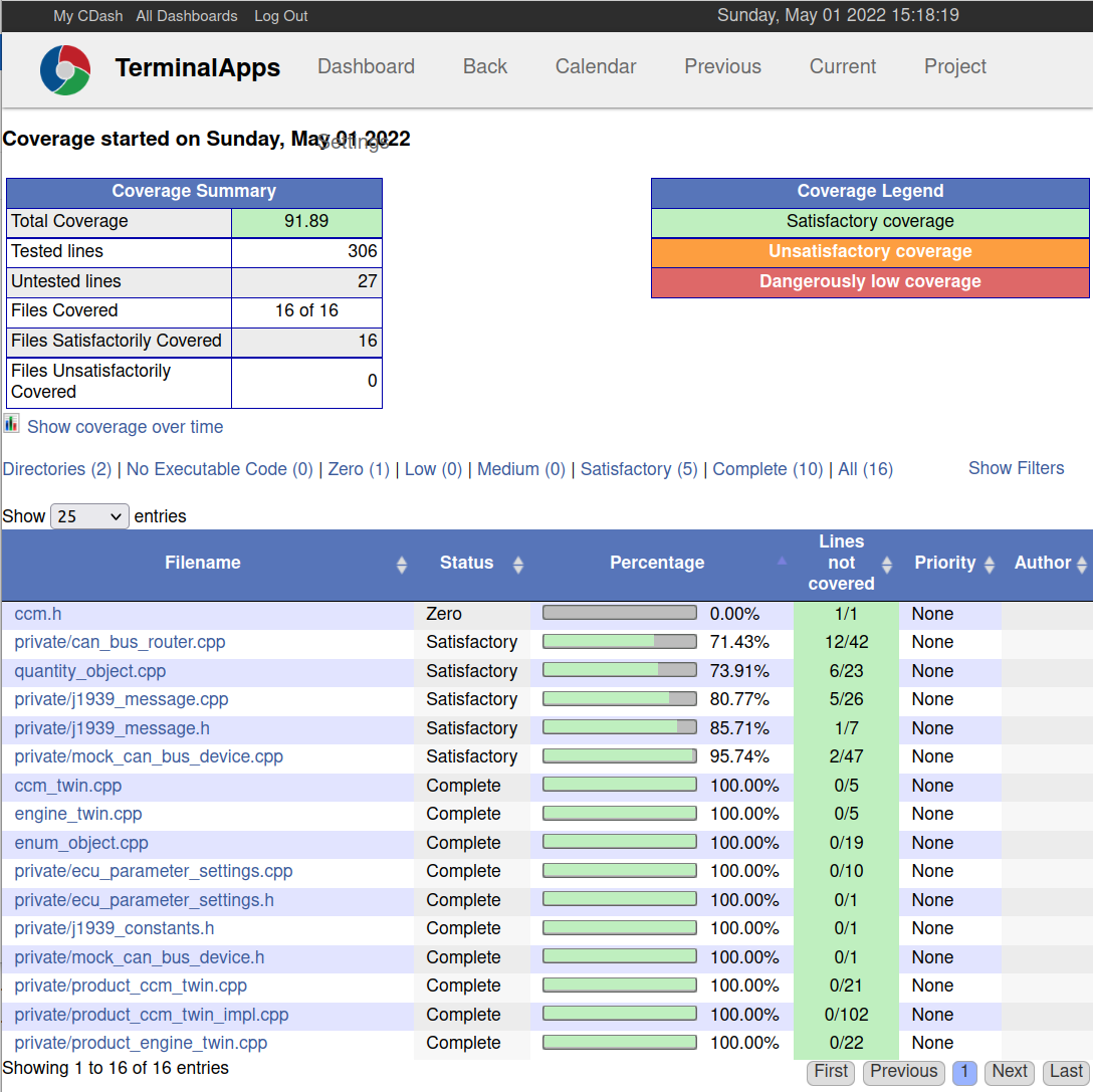 We go to My CDash in the browser and click on the project My Projects > TerminalApps to see the build summary (section Experimental) and the coverage summary (section Coverage).