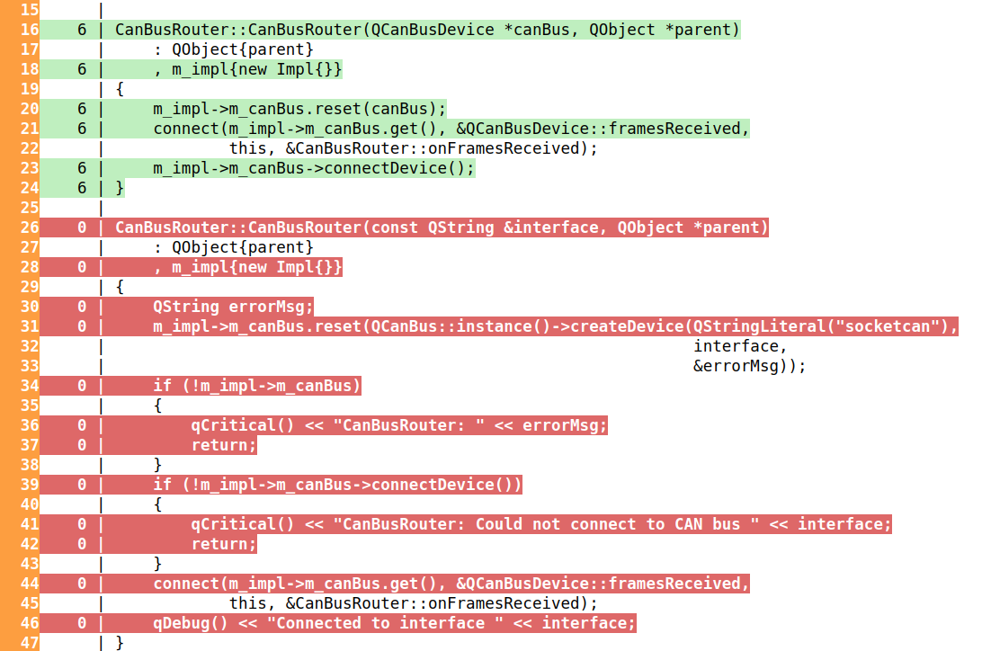 The first covered constructor is only used in test code. The second uncovered constructor is only used in production code. Yes, guilty as charged! I haven't written tests for the second constructor yet. The uncovered code tells me that I must fix this omission, although the fix takes some effort.