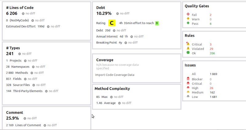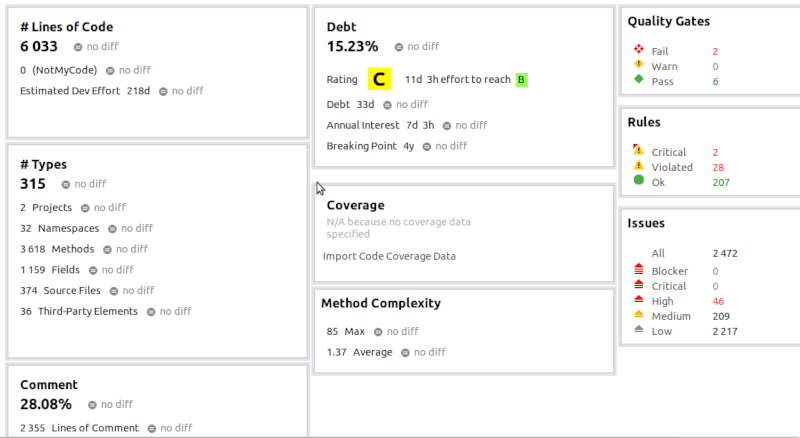 The line count looks odd. Although CppDepend finds 74 more types (including some big classes) than in the first run, it finds 173 lines of code less.