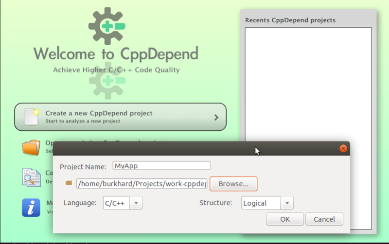 $ /path/to/CppDepend/VisualCppDepend.sh &On CppDepend's welcome dialog, we select Create a new CppDepend project. We enter the project name (e.g., MyApp) and the project directory (e.g., /home/burkhard/Projects/work-cppdepend). We keep C/C++ as the Language and Logical as the Structure.