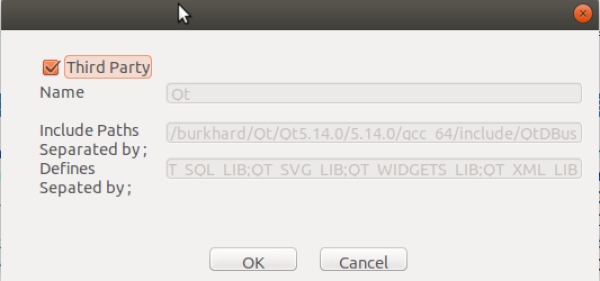 /path/to/Qt/include;/path/to/Qt/include/QtGui;/path/to/Qt/include/QtCore;...in the field Include Paths Separated by ;. We prepare the Qt specific defines in a similar way and enter something similar to