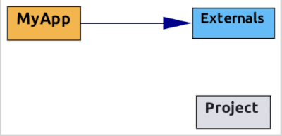 When I switch from the Dashboard tab to the Graph tab, CppDepends shows the top-level view of the dependency graph. The MyApp box contains all the application classes and the Externals box contains the elements from the C and C++ standard libraries. The Project box is empty. I guess that it hides the Qt libraries.