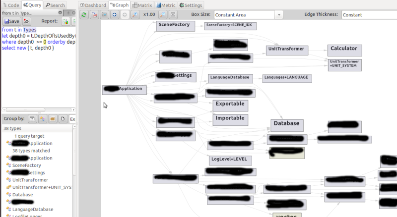 The one thing that kept me going so far with the CppDepend evaluation is the possibility to write my own queries and display them as graphs. CppDepend uses a query language called CQLinq, which has a close resemblance to SQL. We find a description of the CQLinq syntax here and of CQLinq features here. Note that the documentation of the NDepend website is better than the one on the CppDepend website.
