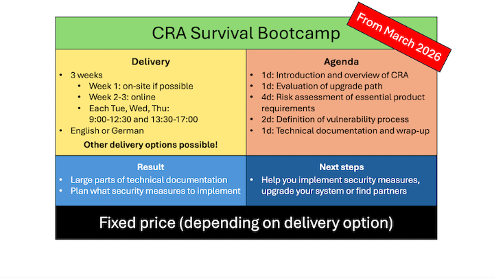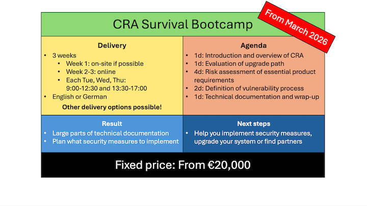 For each topic, I'll explain the requirements of the CRA first. Then, I'll guide you through preparing significant parts of the risk assessment, upgrade path and vulnerability handling process - for your embedded system. You will have a clear idea what to do and how to do it so that you can complete the remaining tasks without my help.