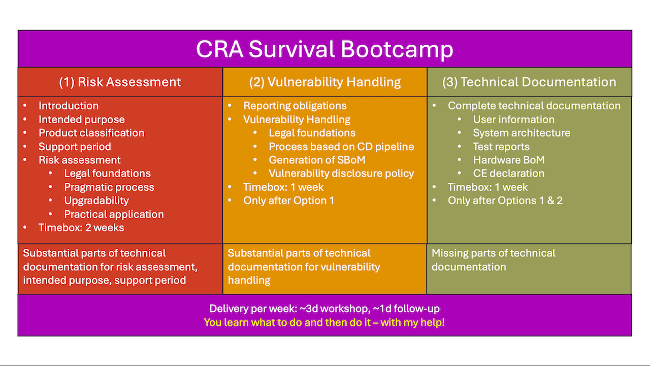 In the bootcamp, you'll learn what requirements the Cyber Resilience Act (CRA) puts on you as a manufacturer and how to satisfy these requirements with reasonable effort. Under my guidance, you'll immediately apply the learned theory to your specific system. The bootcamp delivers three important results: