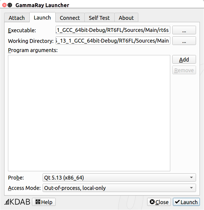 Enter the path to your Executable, the Working Directory and the Program arguments. Then, press the Launch button. You'll see GammaRay's main window.