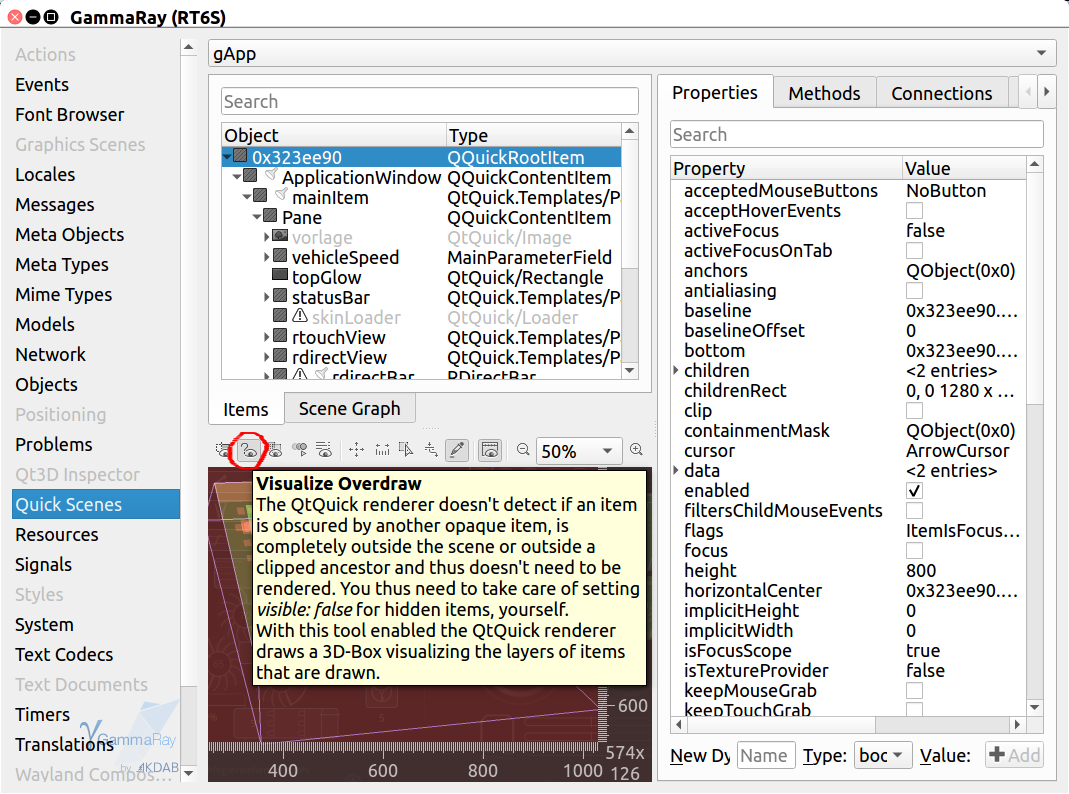 Guiseppe d'Angelo, KDAB, gave a fantastic talk about Optimizing the Rendering of Qt Quick 2 Applications with GammaRay at the Qt Day Italy 2019. Just follow this link to the video. Guiseppe shows that GammaRay makes it easy to detect Overdraw, Clipping, OpenGL batches and other rendering problems in QML applications. My thanks go to Guiseppe for a very instructive talk and to KDAB for building GammaRay.