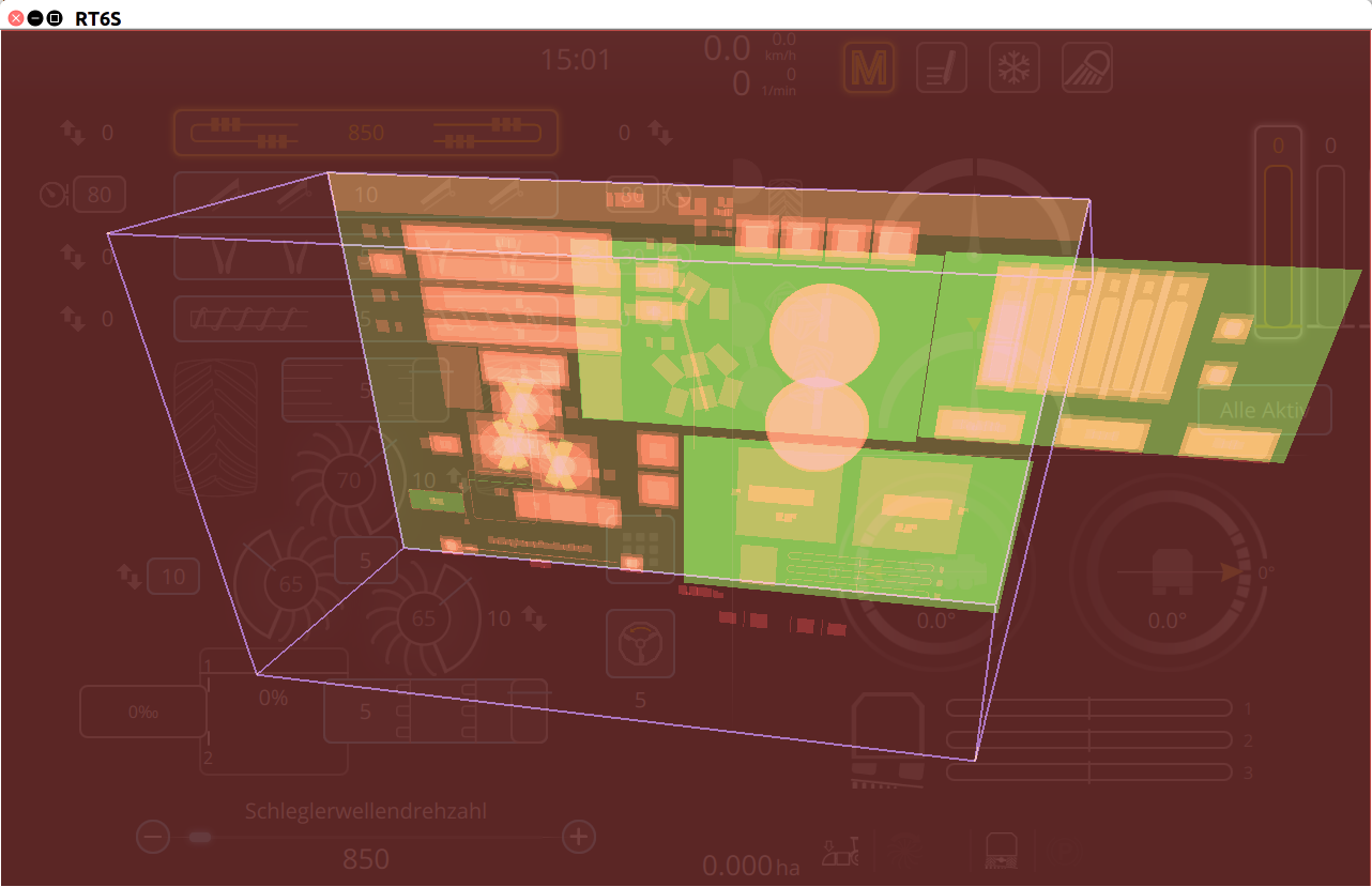 Select the Visualize Overdraw tool marked by the red circle. GammaRay shows a 3D view of the application launched, the home screen of a harvester HMI. The 3D view visualises the z-order (stacking order) of the QML items.