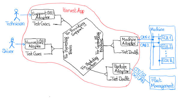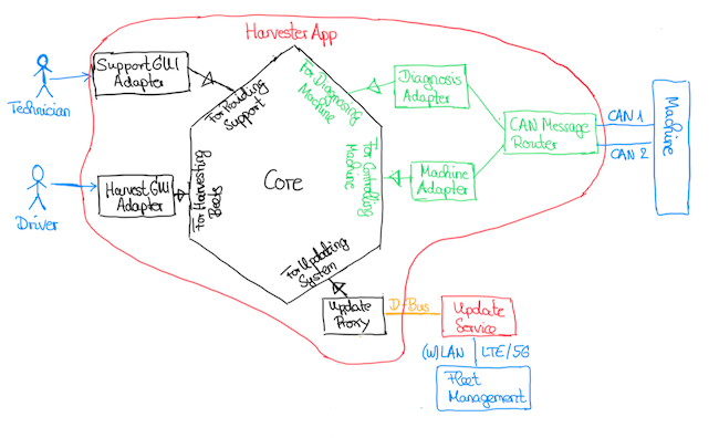 Let us quickly recap the ports-and-adapters architecture. Our running example is the driver terminal of, say, a sugar beet harvester.