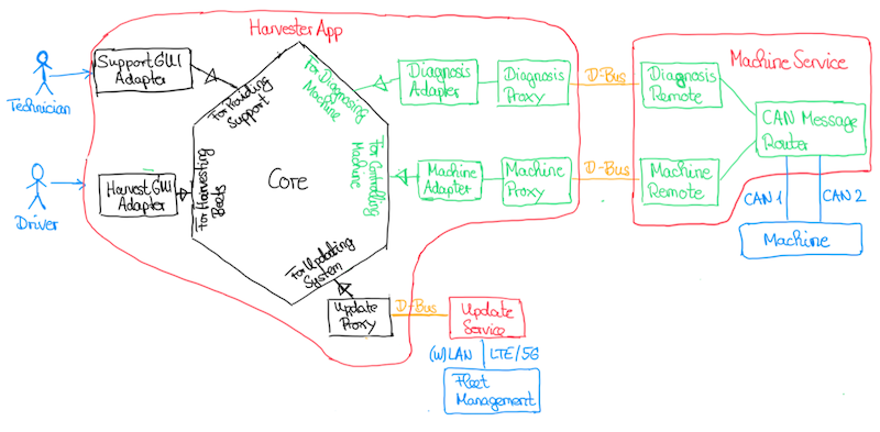 Subdomains that are used only by certain user types for special purposes are good candidates for microservices. They are typically extracted together with their driving and driven adapters. The microservice for diagnosing the machine is an example. - Performance. The Harvester App must process 1500 CAN messages per second in normal operation. This flood would freeze the GUI. Moreover, it doesn't make sense, because the driver can't keep track of 1500 changes per second. In a monolith, we move the processing into threads and ignore too frequent changes. CAN message processing is a natural candidate for a microservice running in its own process. We could give this process a higher priority than the HMI process.