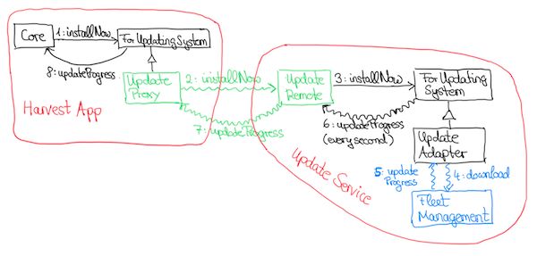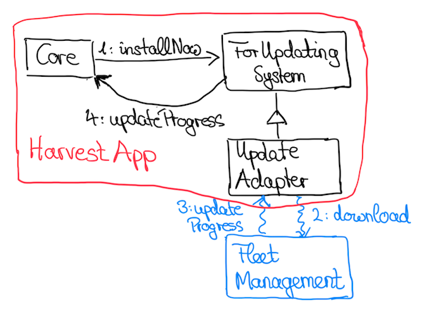 Figure 4 shows the same message sequence in the modular monolith without the Update Service. The important observation is that nothing changed for the Core, Harvest GUI Adapter, Support GUI Adapter and Machine Adapter in the Harvest App. The port For Updating System hides all the additional steps (messages 2, 3, 6 and 7) from the rest of the Harvester App. Hiding complexity and changes is exactly what a good abstraction should do.