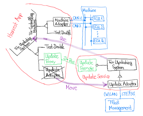 - In the Harvester App, the subdomains For Harvesting Beets and For Providing Support both use the Machine Adapter to get their job done. We must extract the diagnosis functionality from the Machine Adapter into the new Diagnosis Adapter. The subdomain For Providing Support will use the Diagnosis Adapter through the port For Diagnosing Machine and the subdomain For Harvesting Beets the reduced Machine Adapter through the reduced port For Controlling Machine. This restructuring will enable us to extract the separate Diagnosis App later.