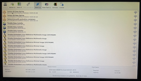 If things go right, the TEZI GUI appears on the HMI display attached to the board. It shows some pre-built Linux images available from the Toradex servers.