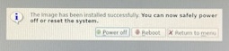 We select our custom-built Linux image from the list (marked with a USB icon) and press the Install button. We press Yes in the confirmation dialog and accept the EULA. Then, it takes a couple of minutes for TEZI to flash the bootloader and the root file system of our Linux image on the board. TEZI shows a progress bar while flashing the image. When finished, TEZI shows the following dialog.