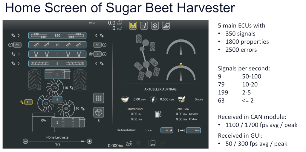 The screenshot above shows the home screen of a sugar beet harvester. The home screen receives roughly 50 CAN messages per second and displays the contents of the CAN messages numerically or graphically.