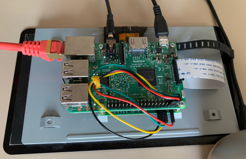 The four coloured leads forward the power from the Raspberry Pi board to the touch display board. The ribbon cable on the right passes the display and touch data between the two boards. The bright red Ethernet cable connects the Raspberry Pi with the development PC over the office LAN. The left cable on the top connects 3.5 mm cinch connector with the portable loudspeaker, an Anker Soundcore Mini. The right cable on the top comes from the power supply.