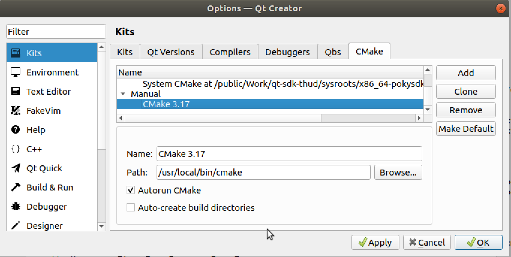 -DQT_QMAKE_EXECUTABLE:STRING=These settings look alright, as we do a Debug build and we didn't set the C compiler, the C++ compiler and the QMake executable. The unset CMAKE_PREFIX_PATH explains why CMake cannot find any configurations for Qt modules (e.g., Qt5CoreConfig.cmake). We also see that QtCreator doesn't pass a toolchain file to CMake. Let us remedy this.