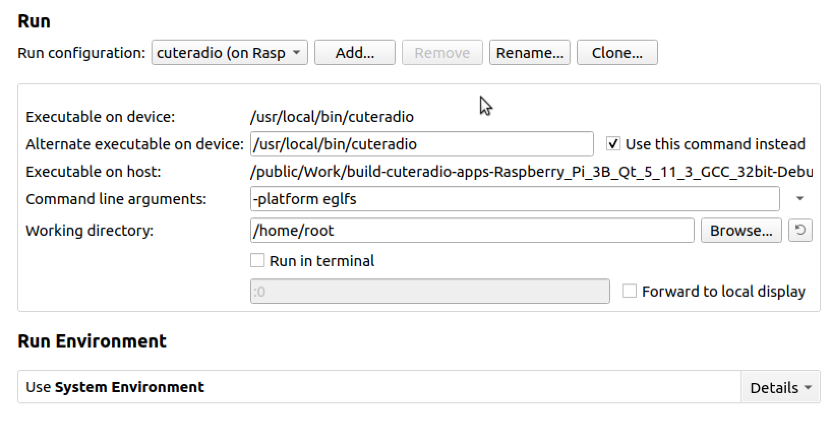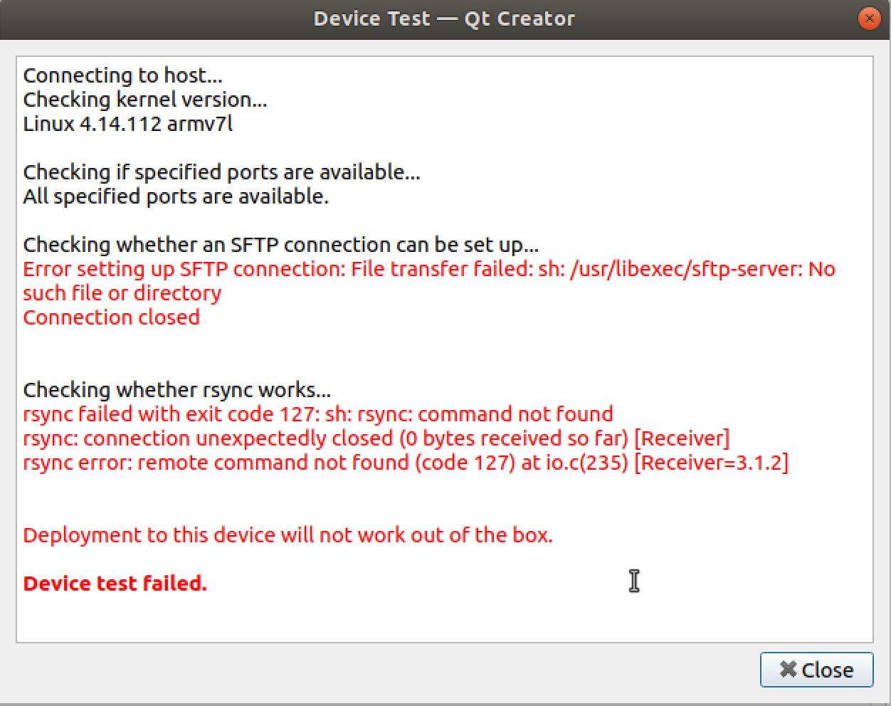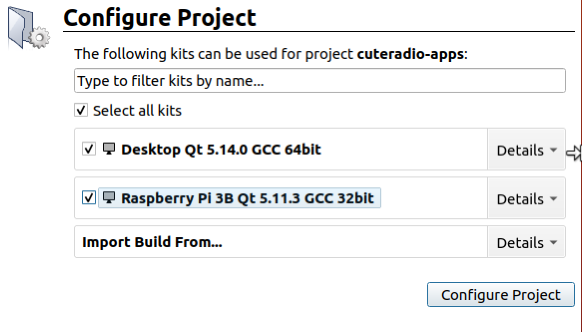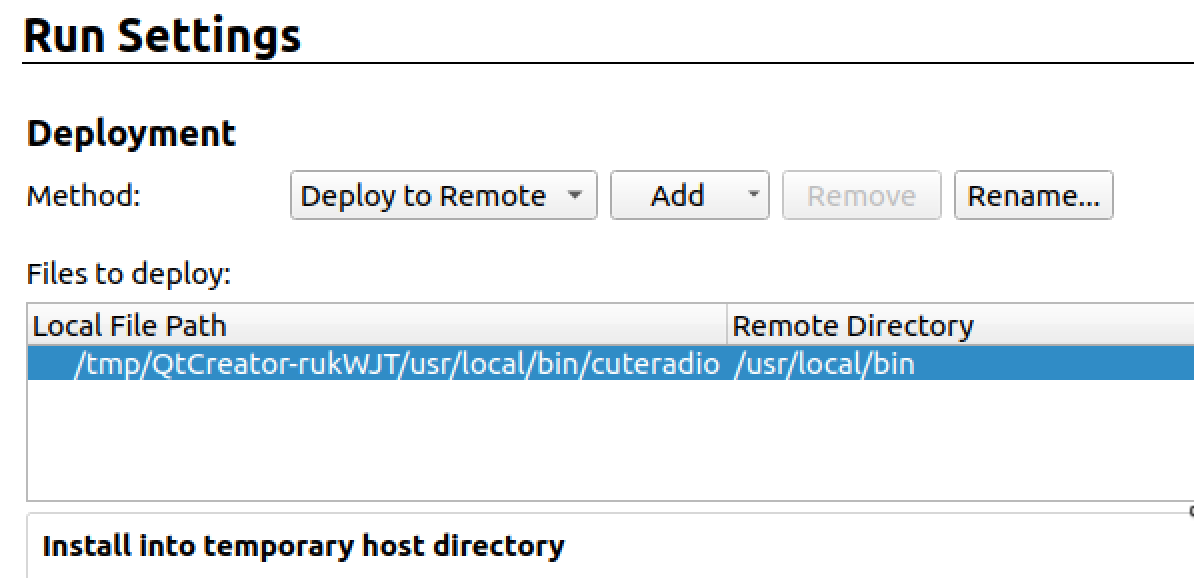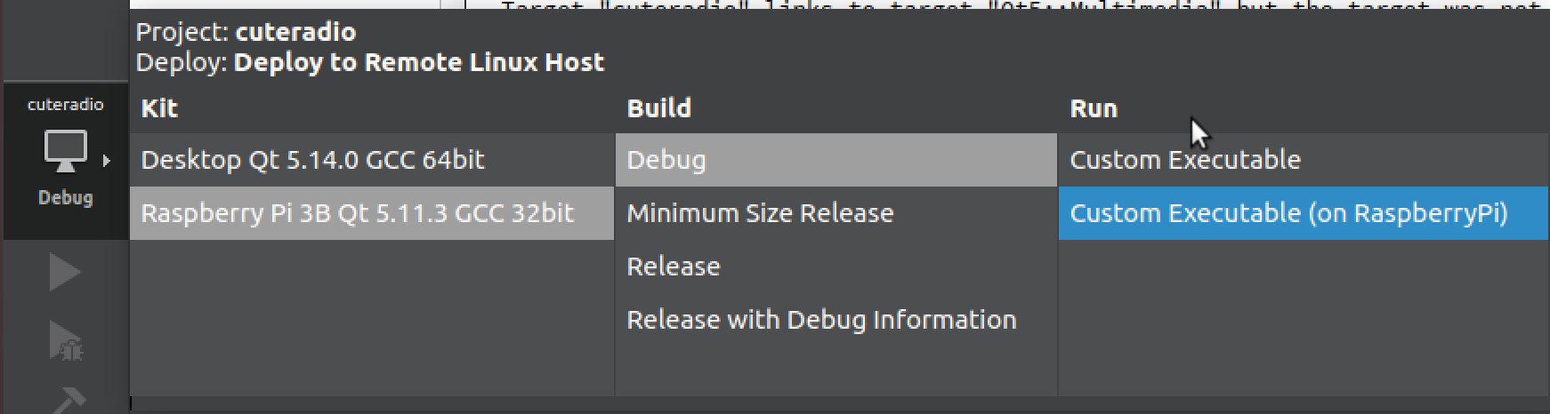 If you followed along Part 1 and built an image before 14 June 2020, you will have to update the layer repositories with repo sync (see here) and the build of the Linux image with bitbake cuteradio-image (see here). Two packages were missing from this Linux image: rsync and sftp-server. QtCreator needs these packages to deploy the radio application from the development PC to the Raspberry Pi. You must burn the updated Linux image on an SD card and plug the SD card into the Raspberry Pi - as described here.