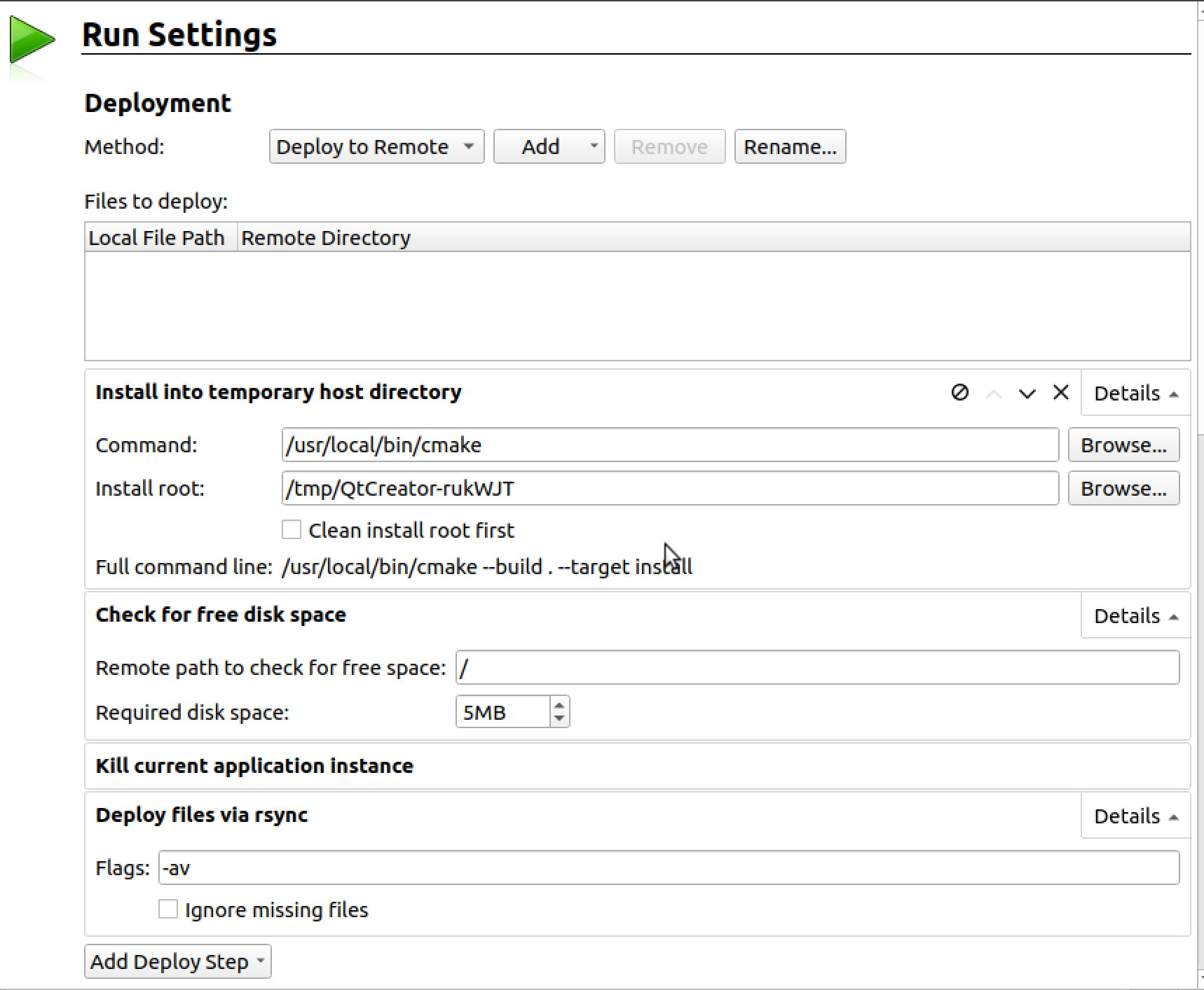 QtCreator fills out the Files to deploy, once it runs the install target. The files to deploy are specified with the CMake install functions in the CMakeLists.txt files. We only install the application executable. QtCreator stages the files to deploy in the install root, before it transfers the files to the target device with rsync in the last deployment step.