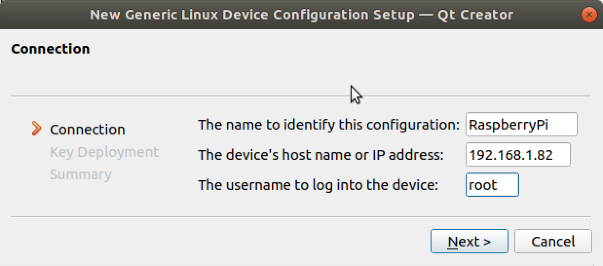 In QtCreator, we open the dialog Tools | Devices | Devices and press the Add button. We select the option Generic Linux Device from the dialog Device Configuration Selection and press the Start Wizard button. In the first wizard step Connection, we enter RaspberryPi as the configuration name, 192.168.1.82 as the IP address of the target device and root as the user name for logging into the device.
