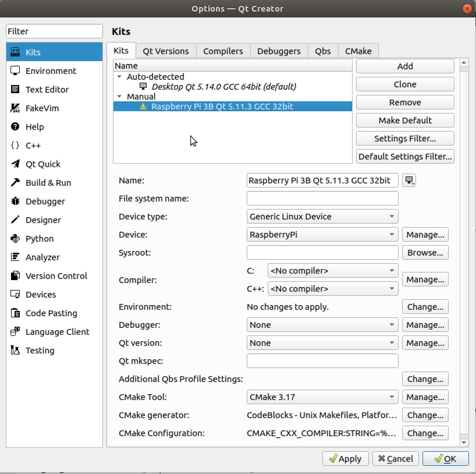 We clear the output pane General Message so that we can recognise new messages from the next CMake run more easily. We clear CMake's variable cache CMakeCache.txt by executing the action Build | Clear CMake Configuration. This prevents us from debugging problems with stale CMake variables. We select the Raspberry Pi kit on the tab page Tools | Options | Kits | Kits and press the button Change... in the bottom line CMake Configuration.