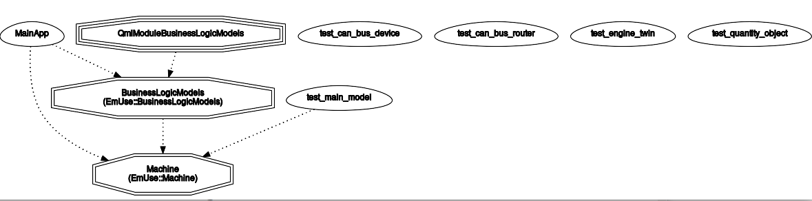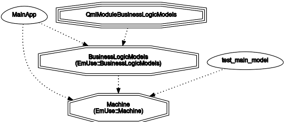 As a composition root, the executable MainApp creates the BusinessLogic and the Machine object and links privately against the respective shared libraries. The module library QmlModuleBusinessLogicModels is a QML module and makes the C++ models from its backing library BusinessLogic available to QML.