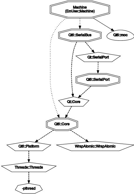 A look at eu-machine/src/CMakeLists.txt confirms that Machine depends on the shared libraries Qt6::Core and Qt6::SerialBus privately and that it must run Qt6::moc. The external dependencies reached from Machine don't help understand the harvester terminal. Hence, we'll exclude them from the graphs in section Excluding External Libraries.